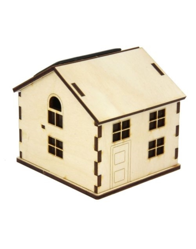 Išimkite rinkinio dalis iš dėžutės ir atskirkite medines detales. Sekite iliustruotu vadovu, sujunkite pažymėtas sienas, sutvirtinkite klijais, o tada uždėkite ant pagrindo. Atidžiai įmontuokite baterijos blokelį, sujunkite laidus ir valdymo jungiklį. Laidai prie saulės skydelio jungiami pirštais prisukant varžtelius, nenaudokite atsuktuvo. Saulės skydelis tvirtinamas ant stogo. Ši stogo dalis įspraudžiama į angas, bet neklijuojama, kad akumuliatorių, esant poreikiui, galima būtų pakeisti.