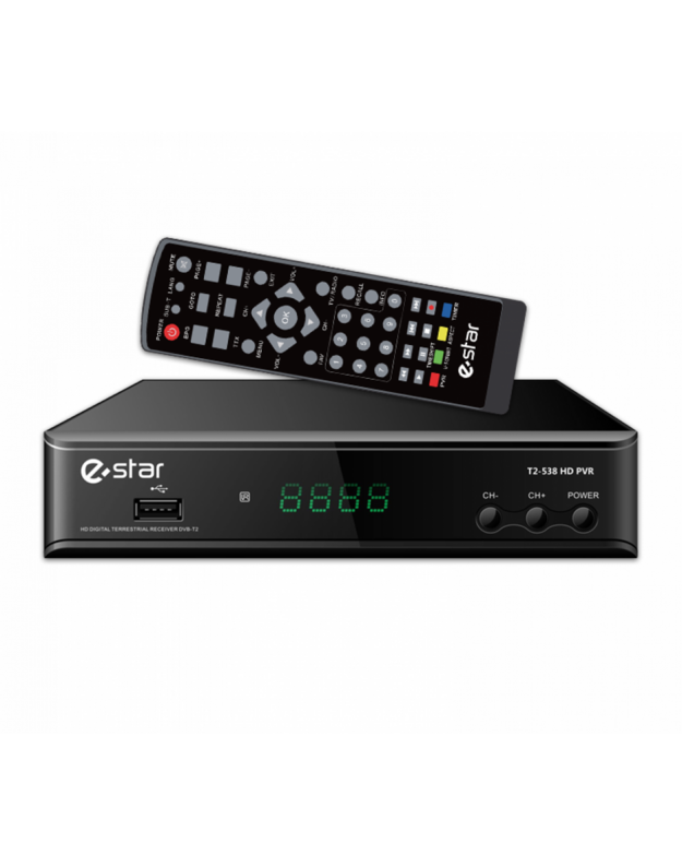 eSTAR DVBT2 538 HD - antžeminės televizijos priedėlis - imtuvas, skirtas senesnės kartos televizoriams, kurie neturi integruoto (įmontuoto) skaitmeninio DVB-T / DVB-T2 MPEG -4 imtuvo. Priedėlį prie televizoriaus galima prijungti per SCART ar HDMI jungtis (kabelius).