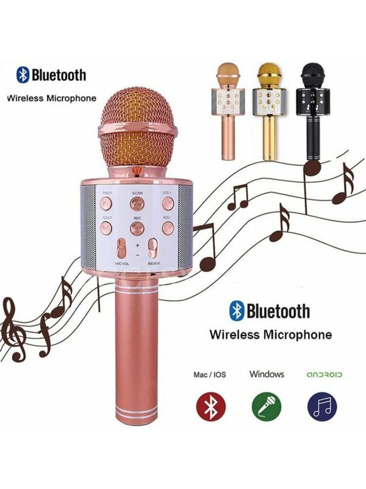 Išmanusis mikrofonas " WS-858" su bluetooth ir USB. Mikrofonas skirtas dainuoti karaoke pagal pasirinktas dainas. Dainas galima leisti iš išmanaus telefono bluetooth ryšiu arba iš USB laikmenos. Galima klausytis radio. Mikrofonas taip pat leidžia reguliuoti muzikos, dainavimo garsą, aidą, bosus. Mikrofono galvutė turi tris triukšmo mažinimo procesus, efektyviau paryškinkite savo gražų balsą. Visos idealios dainos, balso programos gali būti naudojamos, kaip "Bluetooth" garsiakalbiai.